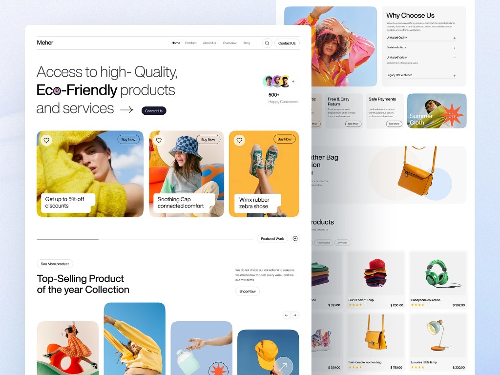 A full e-commerce website design for Meher, featuring high-quality eco-friendly products, customer proof elements, and a clean modern layout with product highlights and top-selling collections.